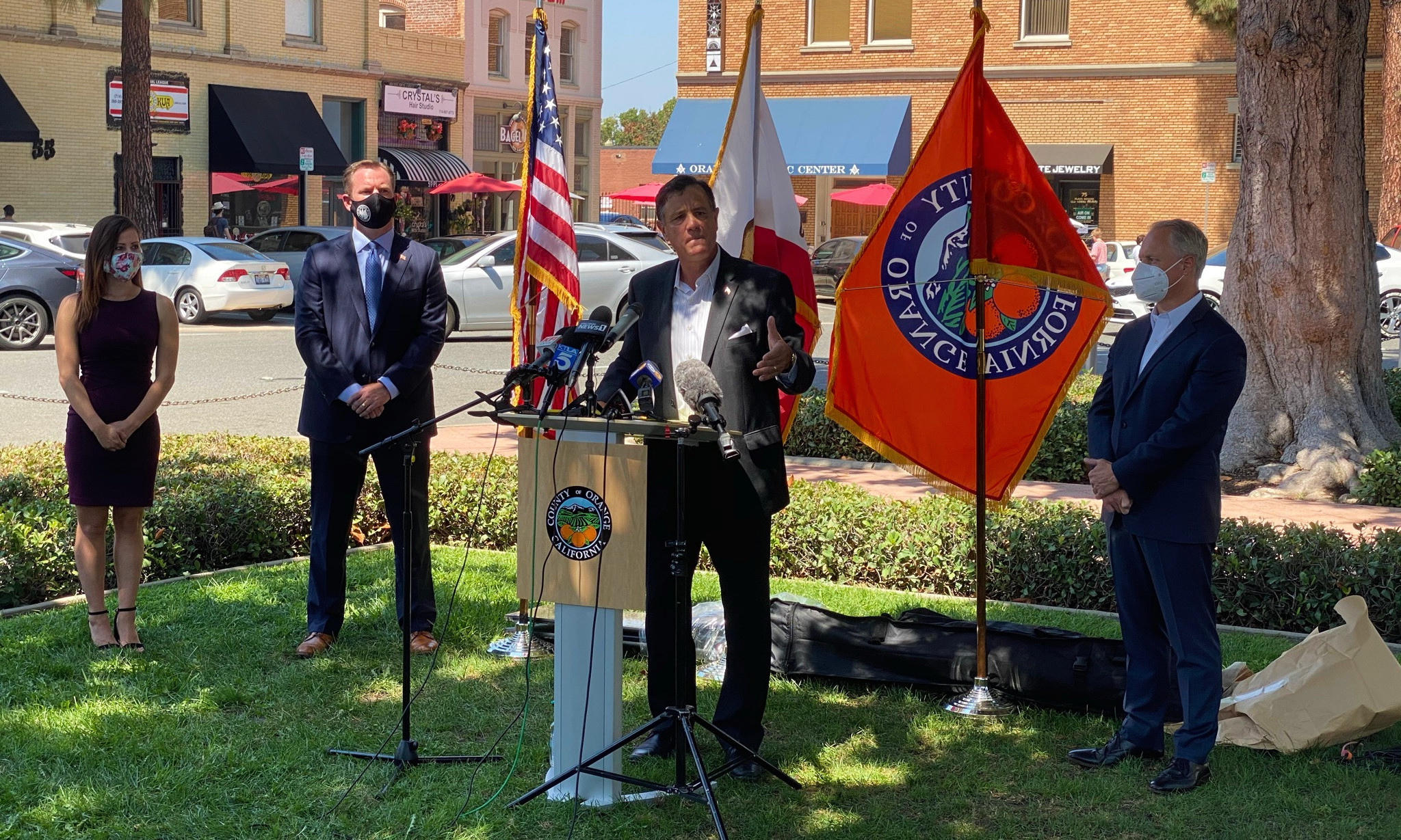 Standing in Old Towne Orange’s Plaza Park, County Supervisor Donald Wagner, Newport Beach Mayor Will O’Neill, and Lake Forest City Councilman Dwight Robinson addressed the state’s strategy for reopening and called on Gov. Gavin Newsom to loosen restrictions they said were hurting Orange County residents.