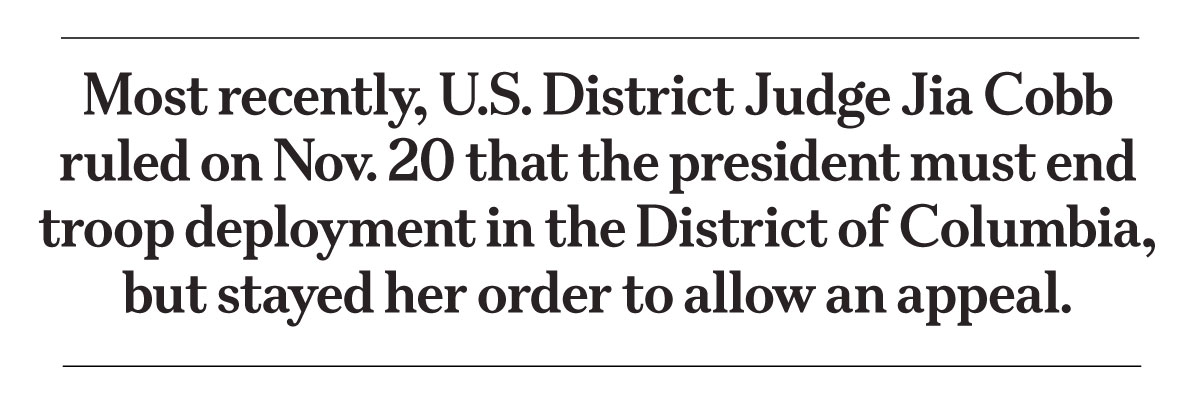 Most recently, Judge Jia Cobb of the U.S. District Court for the District of Columbia ruled on Nov. 20 that the president must end troop deployment in Washington, saying that the president can deploy troops only to address a specific situation, not for “whatever reason” he chooses. She paused that order to give the government time to appeal.