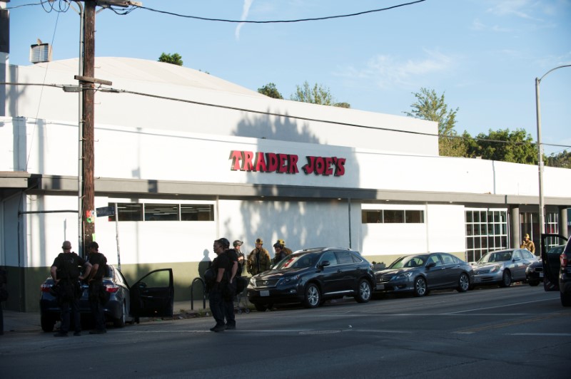Police officers escort people after a suspect barricaded inside a Trader Joe's supermarket in the Silverlake neighborhood of Los Angeles, on July 21, 2018. (ROBYN BECK/AFP/Getty Images)