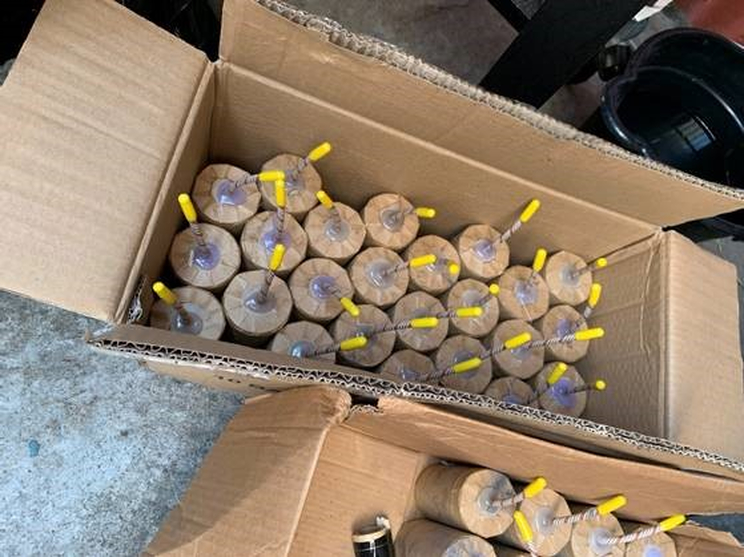 Boxes of illegal large homemade fireworks explosives in South Los Angeles, Calif., in July 2021. (ATF/United States Attorney's Office Central District of California via AP)