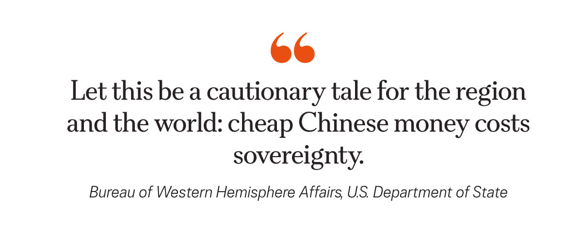 “Let this be a cautionary tale for the region and the world: cheap Chinese money costs sovereignty,” the U.S. State Department’s Bureau of Western Hemisphere Affairs wrote in a February statement.