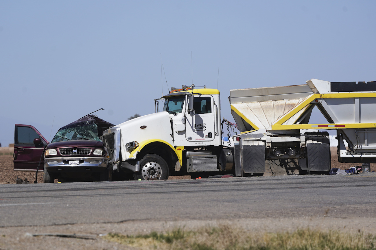 California Highway Patrol officers investigate a crash site after a collision between a Ford Expedition sport utility vehicle and a tractor-trailer truck in Holtville, Calif., on March 2, 2021. (Bing Guan/Reuters)