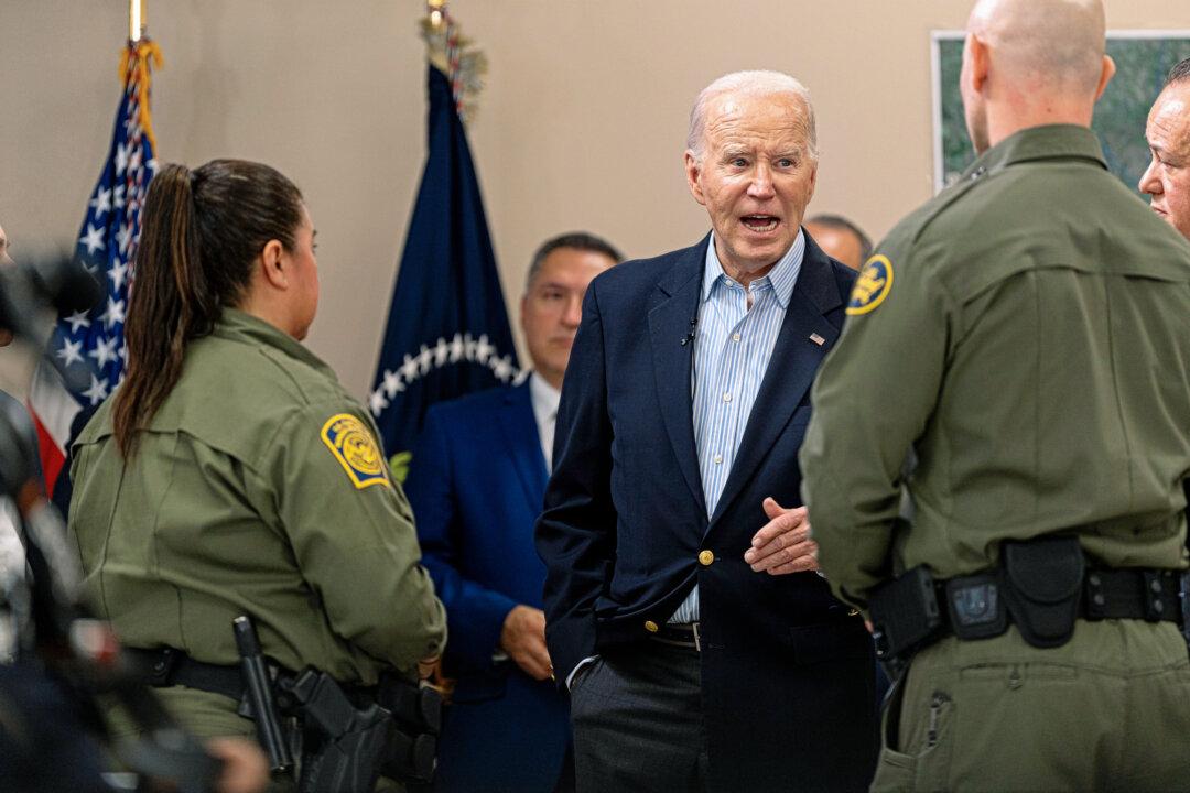 (Top) President Joe Biden speaks with Customs and Border Protection officers during a visit to the Brownsville Station in Olmito, Texas, on Feb. 29, 2024. (Bottom L) Todd Bensman, senior national security fellow at the Center for Immigration Studies. (Bottom R) A Border Patrol agent listens to radio chatter, near the border wall of San Diego, Calif., on May 31, 2023. (Cheney Orr/Getty Images, Jack Wang/The Epoch Times, John Fredricks/The Epoch Times)