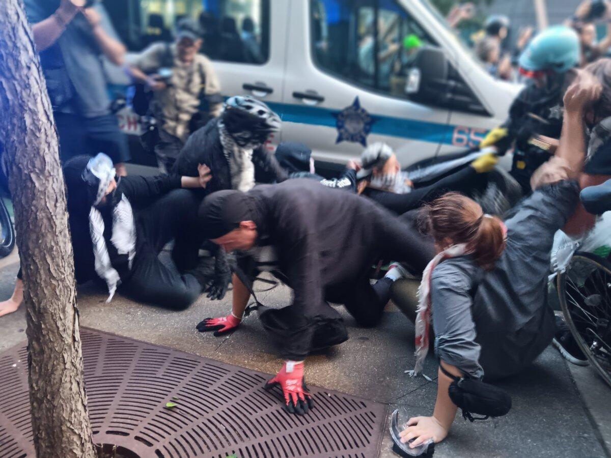 A protester is toppled as police and demonstrators clash near the Israeli consulate in Chicago with the Democratic National Convention happening nearby on Aug. 20, 2024. (Nathan Worcester/The Epoch Times).