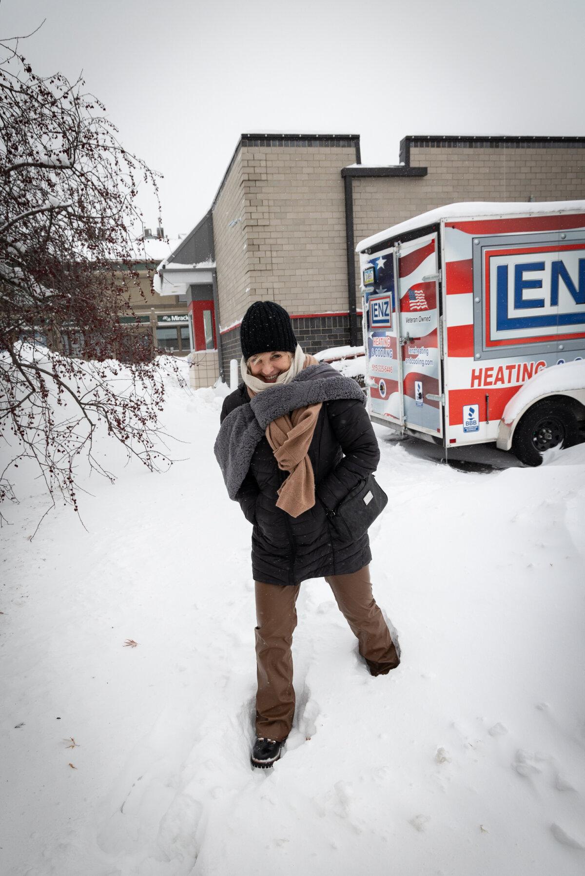 Epoch Times reporter Janise Hisle trudges through the snow to get to a press event in Iowa on Jan. 13, 2024. (John Fredricks/The Epoch Times)