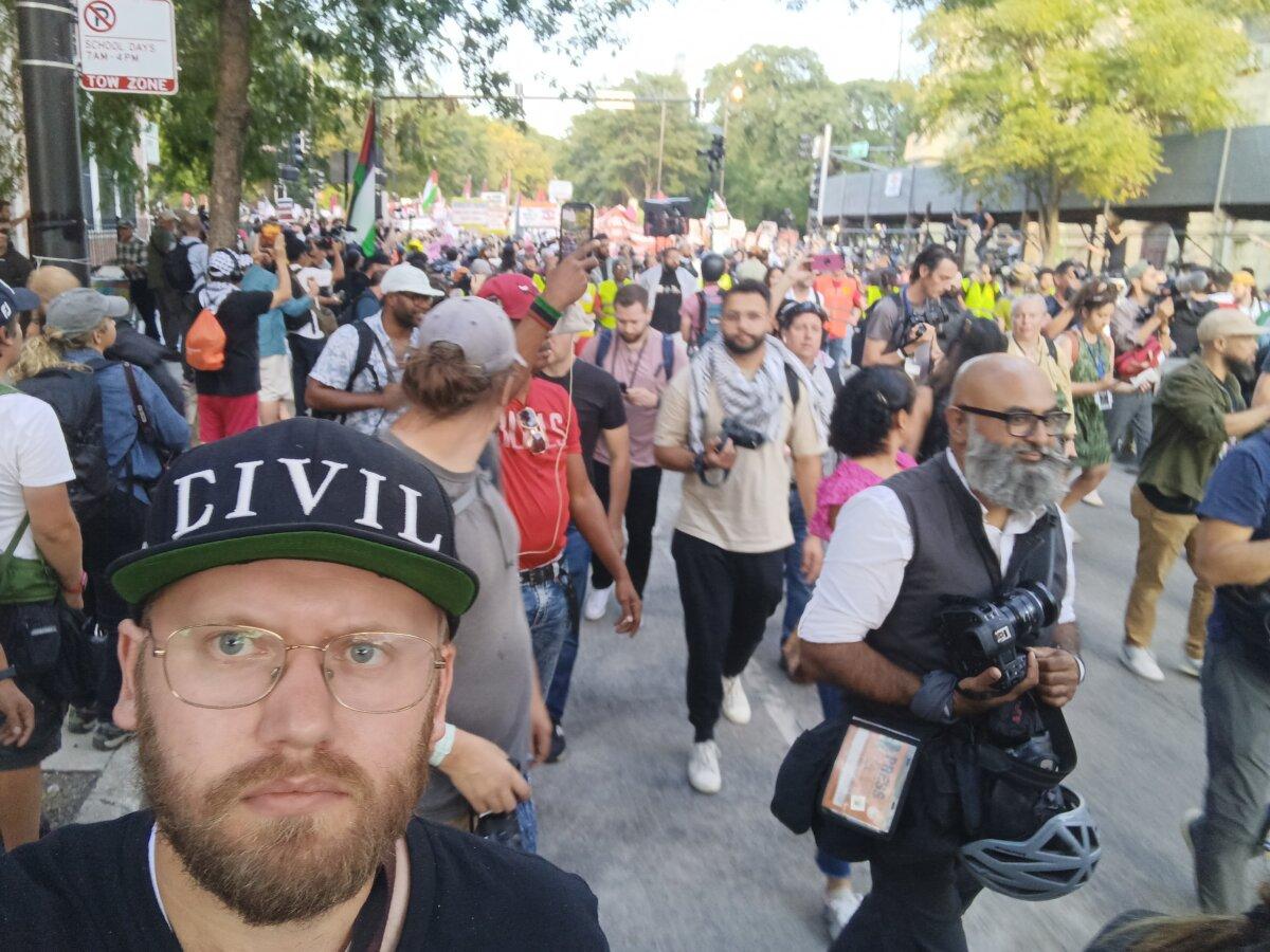 Epoch Times reporter Nathan Worcester snaps a selfie while embedded with protesters near the 2024 Democratic National Convention in Chicago on Aug. 22, 2024. (Nathan Worcester/The Epoch Times)