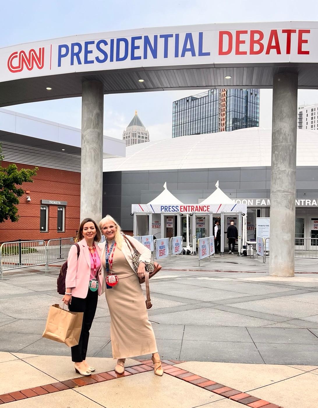 Epoch Times reporters Emel Akan (L) and Janice Hisle prepare to cover the presidential debate between President Joe Biden and former President Donald Trump in Atlanta on June 27, 2024. (Madalina Vasiliu/The Epoch Times)