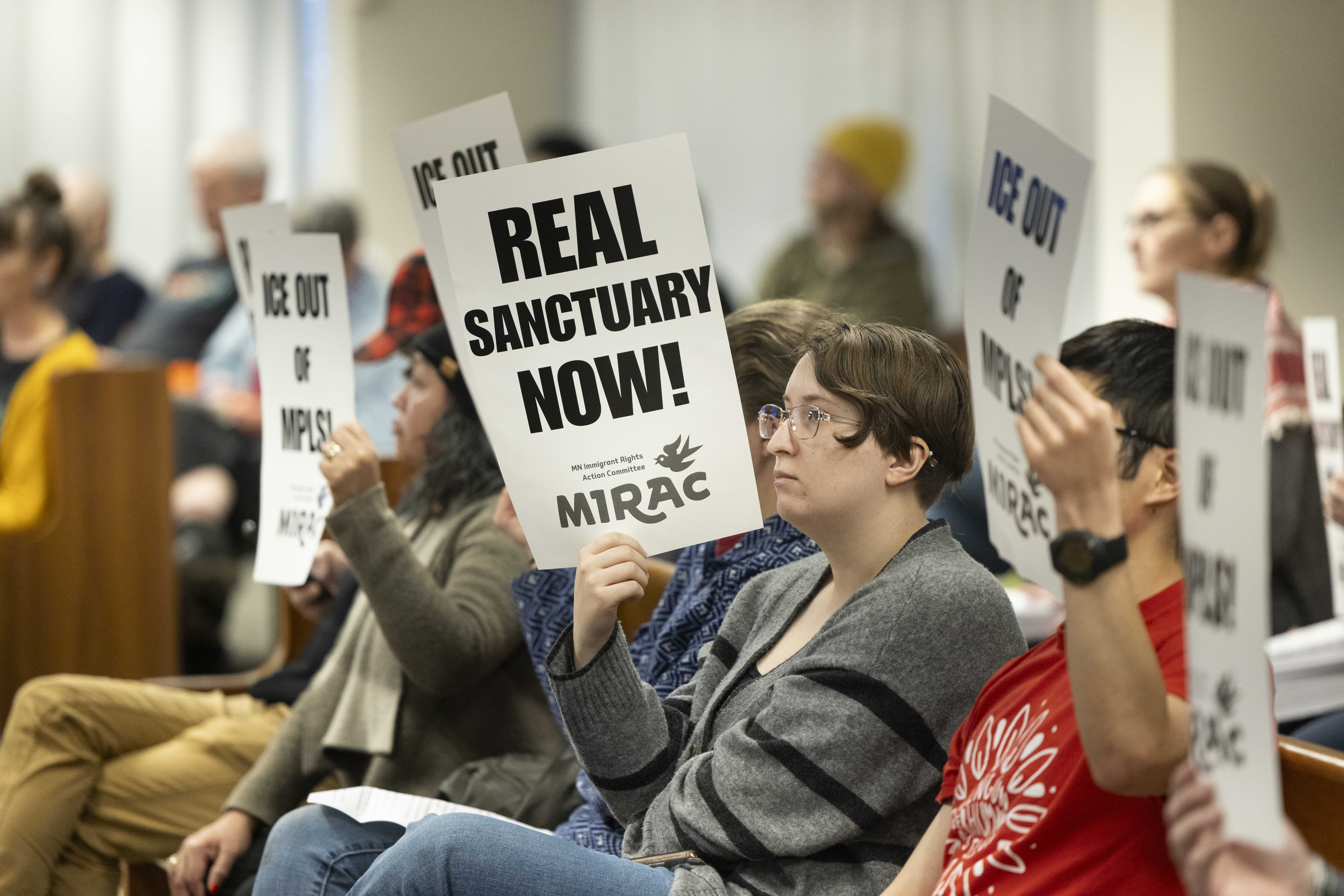 He was part of a capacity crowd of 50 people in the council committee’s meeting room. Many attendees held commercially printed black-and-white posters that said, “ICE out of MPLS” and “Real Sanctuary Now.” An overflow room was filled to its 28-person limit, where a video broadcast the meeting.