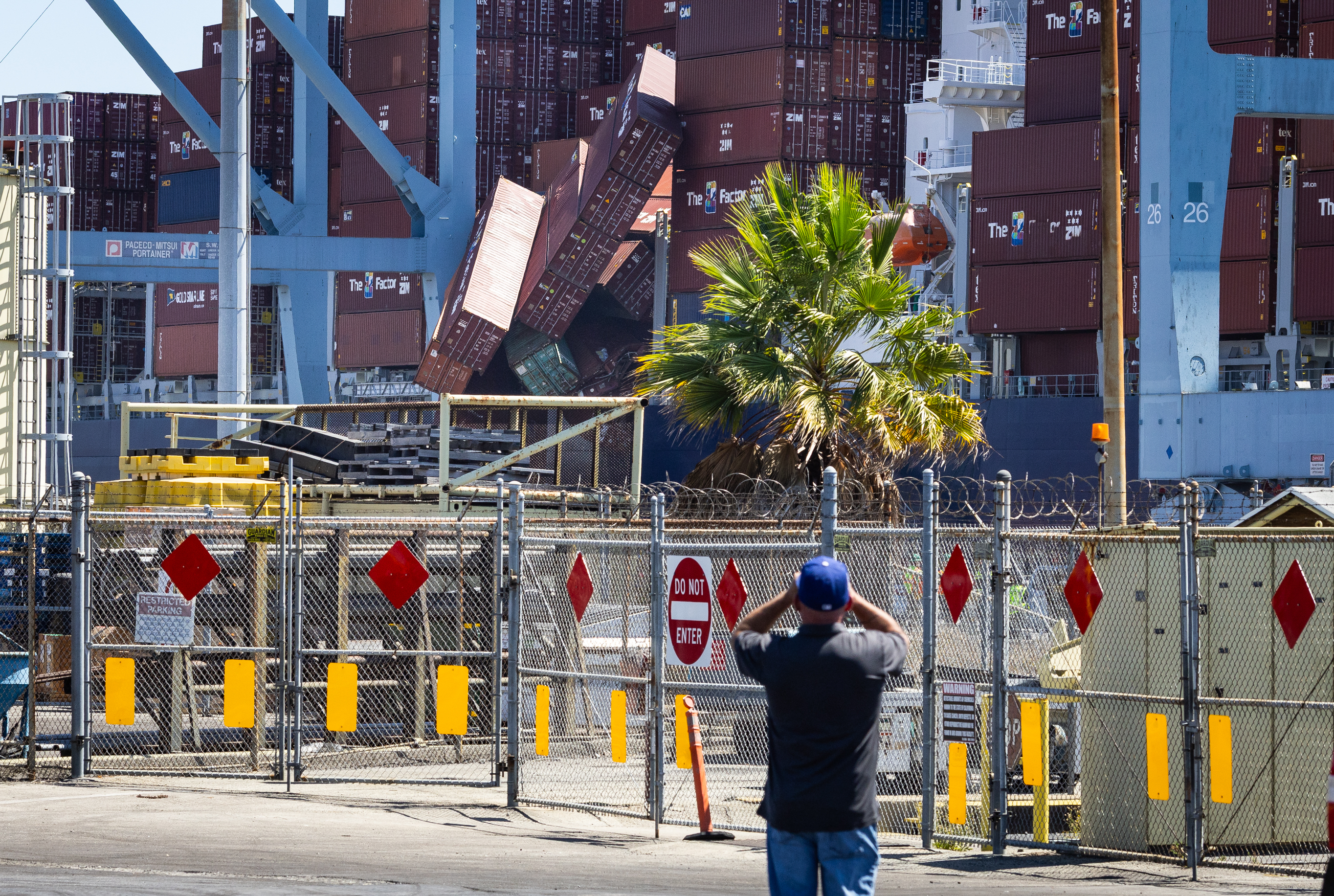 Collapsed shipping containers lay scattered along Pier G in the Port of Long Beach, Calif., on Sep. 9, 2025. (John Fredricks/The Epoch Times)