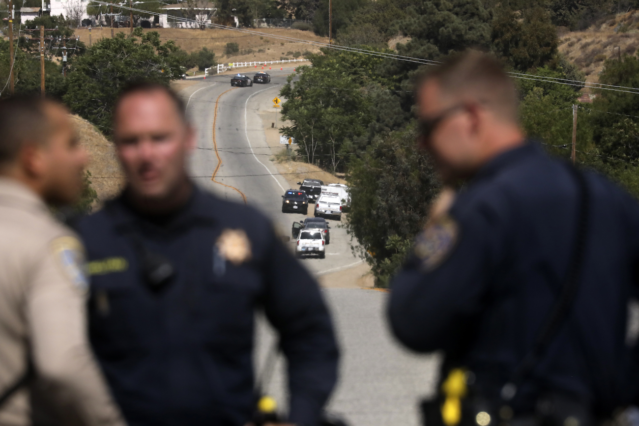 A firefighting helicopter makes a water drop on a house engulfed in fire, in Acton, Calif., on June 1, 2021, where a suspect fled to after a shooting at a fire station. (David Swanson/AP Photo)
