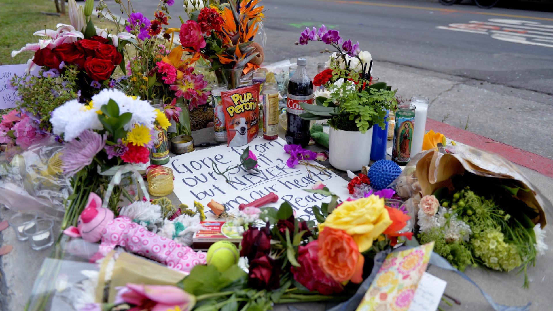 A man and his dog stop at the memorial for Jessica Bingaman in Long Beach, Calif., on May 8, 2019. (Brittany Murray/The Orange County Register via AP)