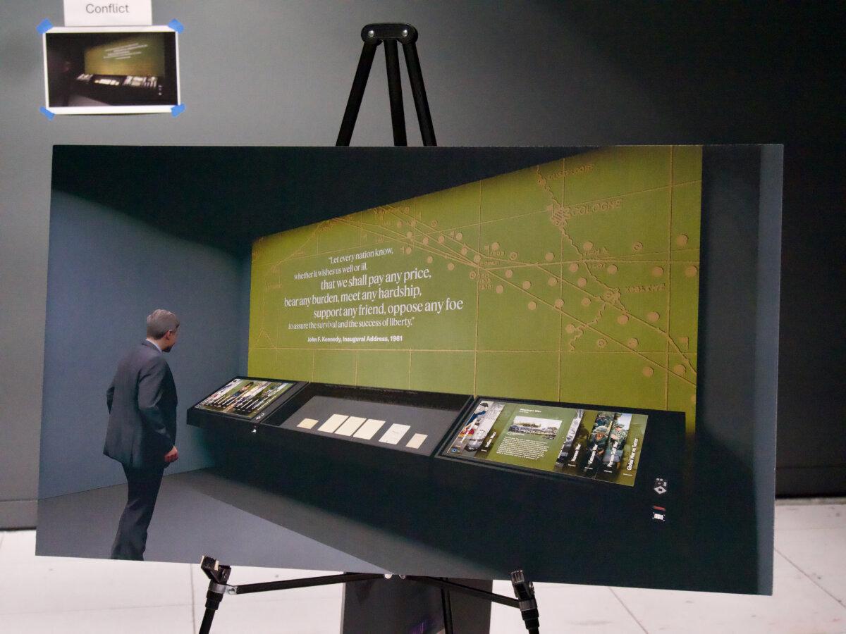 A poster shows how the Crisis and Conflict room in the new exhibit will look, as seen on the tour at the National Archives in Washington, on June 4, 2025. (Travis Gillmore/The Epoch Times)