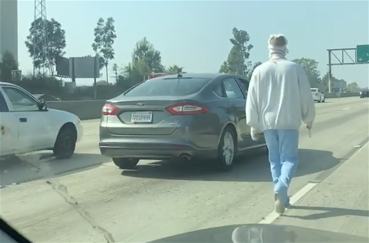 “Slowed down traffic .. thinking it was an accident,” read the caption. “Nope just a man in bandages walking in the early afternoon down a major freeway.”