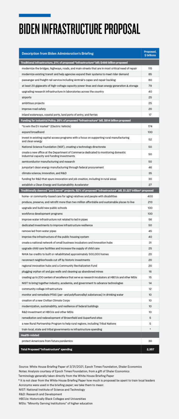 The last half of the Biden Administration’s proposed “infrastructure” legislation, or 52 percent, would go toward projects which traditionally might have been called “pork barrel” projects.