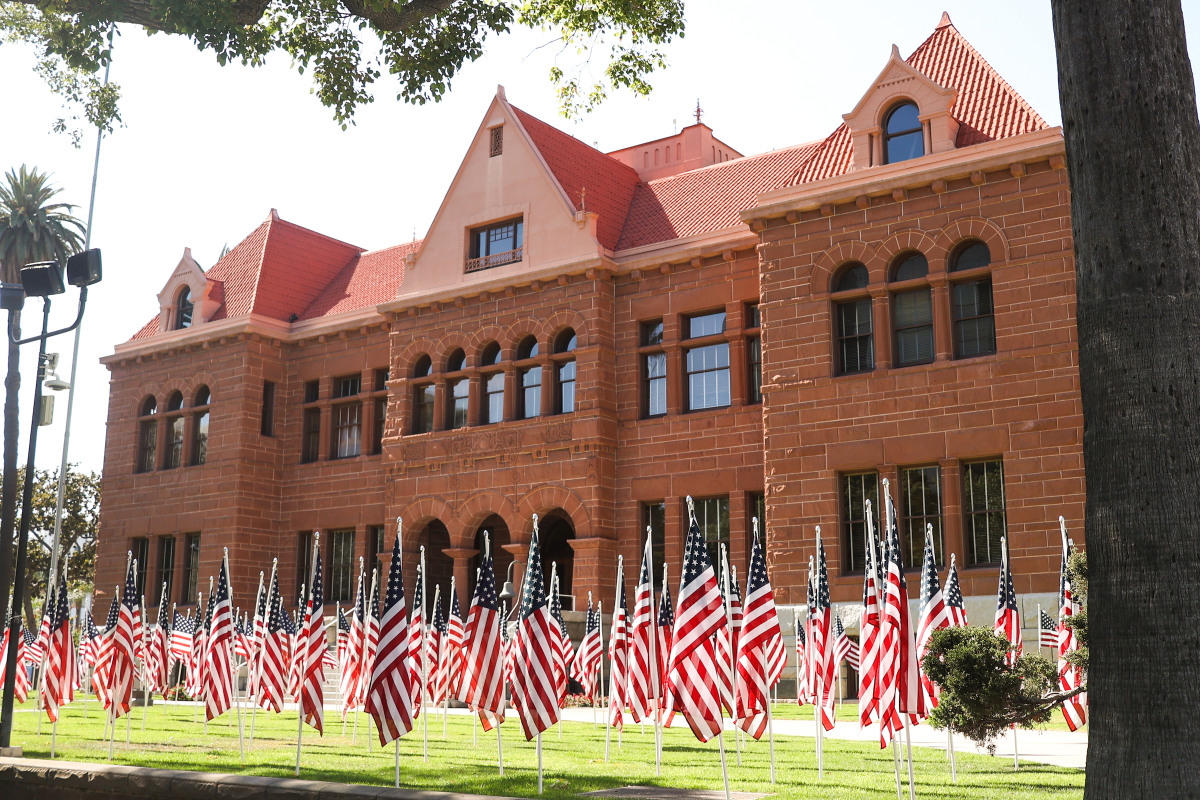 In Santa Ana, hundreds of American flags are currently on display on the front lawn of the historic Old Orange County Courthouse.