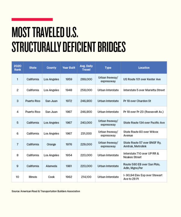 However, on its “Most Traveled U.S. Structurally Deficient Bridges” report for 2020, the American Road and Transportation Builders Association said six of the top 10 most-travelled bridges in the U.S. in need of repair are in Los Angeles or Orange counties.
