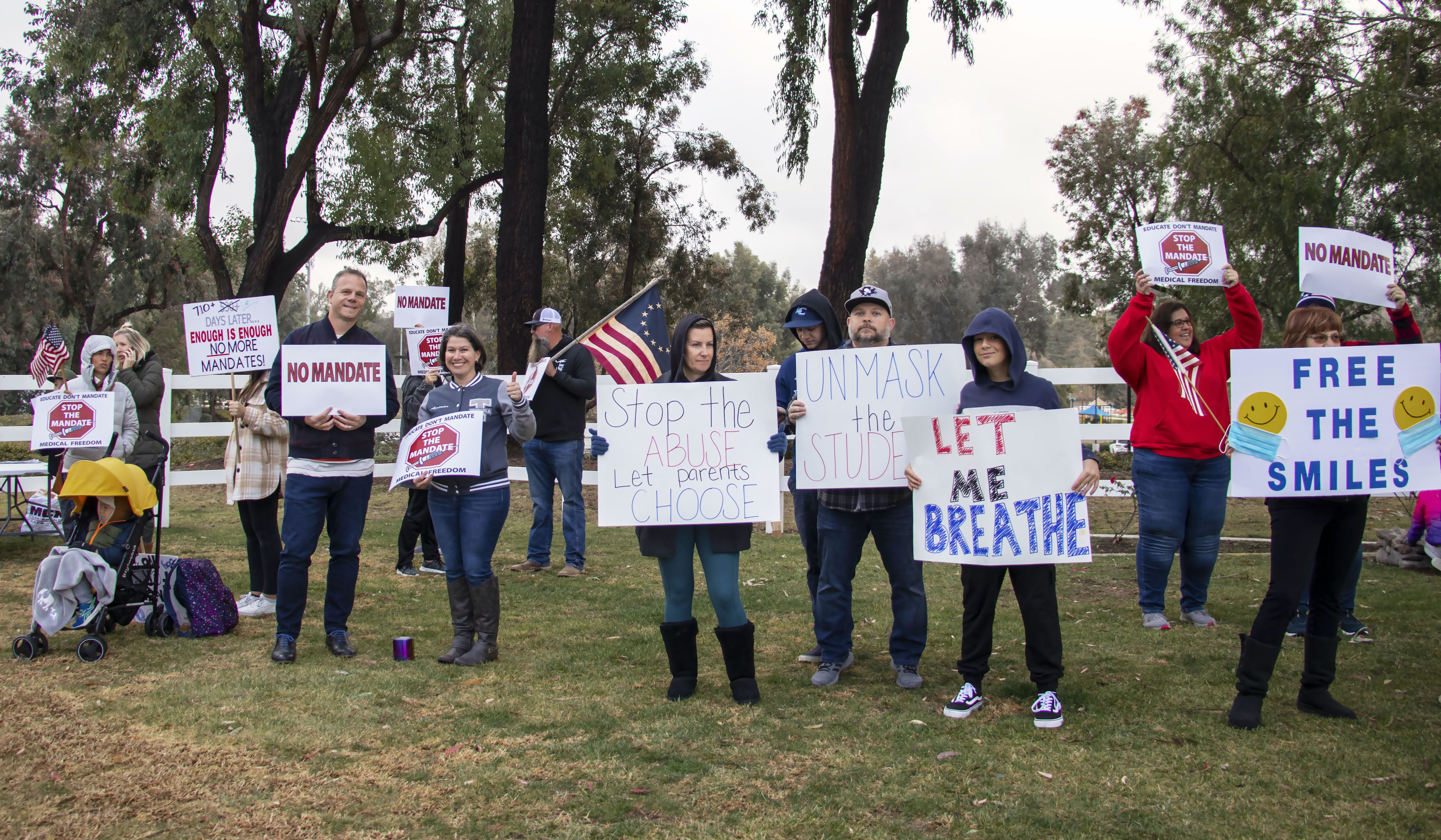Parents, teachers, and students protest mask and vaccine mandates in Temecula, Calif., on Feb. 22, 2022. (Courtesy of Stephanie Dawson)