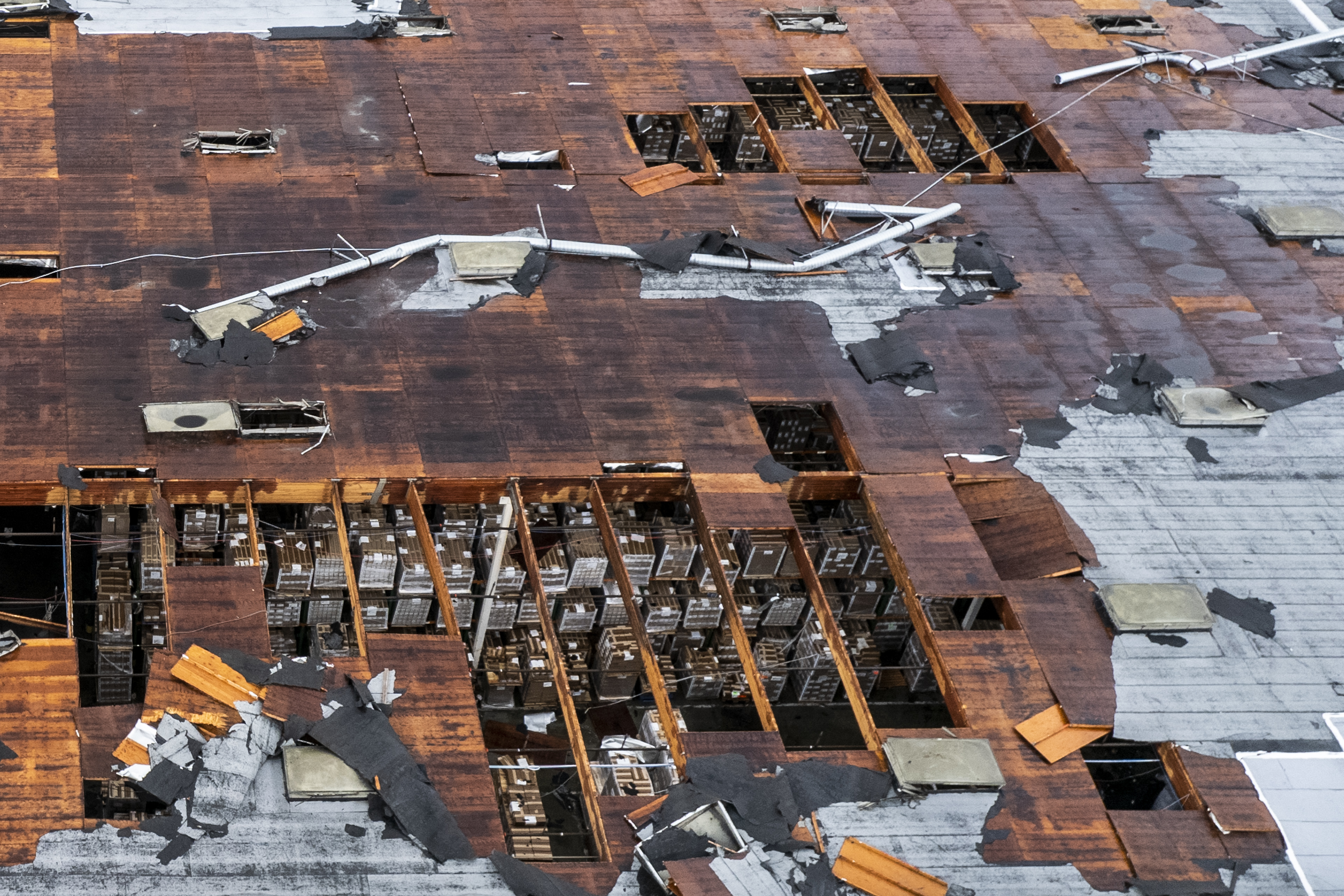 Nobody was hurt, but the gas line was severed, fire sprinklers broke, all the skylights shattered and a 5,000-square-foot section of roof was “just gone,” Turner said. He said his polyester fiber business, Turner Fiberfill, could be closed for months.