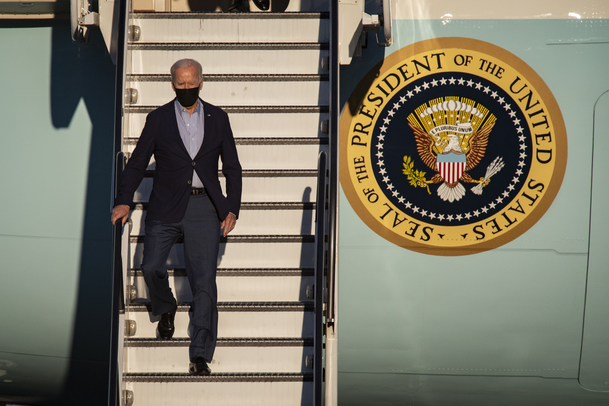 President Joe Biden lands at Long Beach Airport with California Governor Gavin Newsom in Long Beach, Calif., on Sept. 13, 2021. (John Fredricks/The Epoch Times)