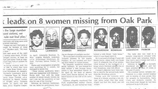 A 1987 newspaper clipping of cases of missing women from Oak Park possibly tied to Morris Solomon Jr. (Courtesy of Antonio Harvey)