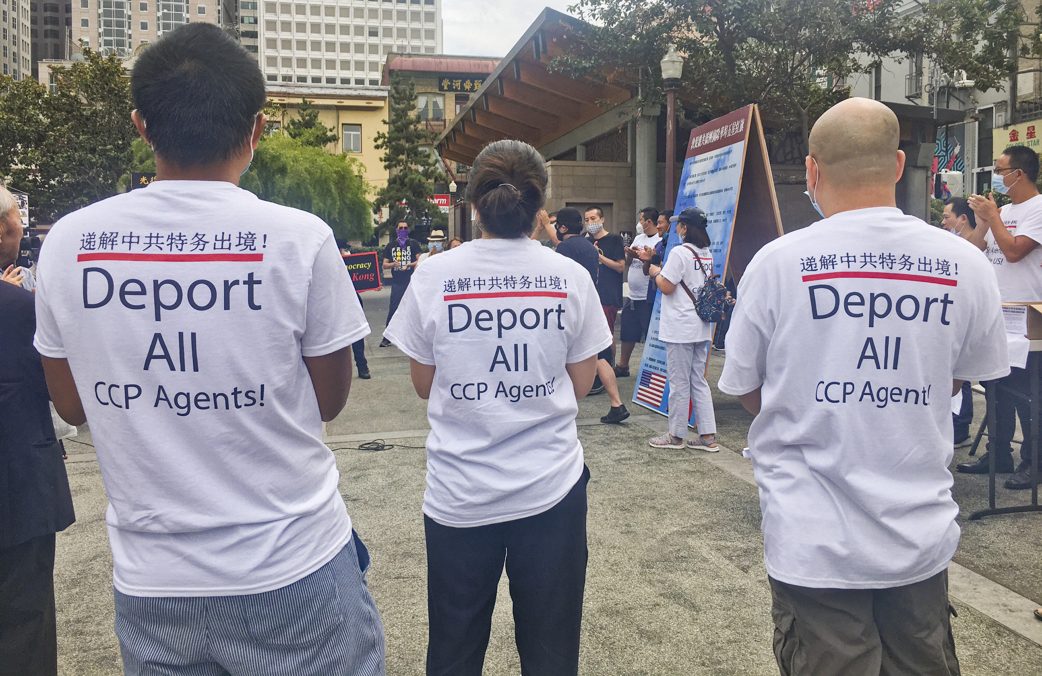 Their white shirts read, “Deport All CCP Agents!” Their black signs read, “Free Hong Kong.”