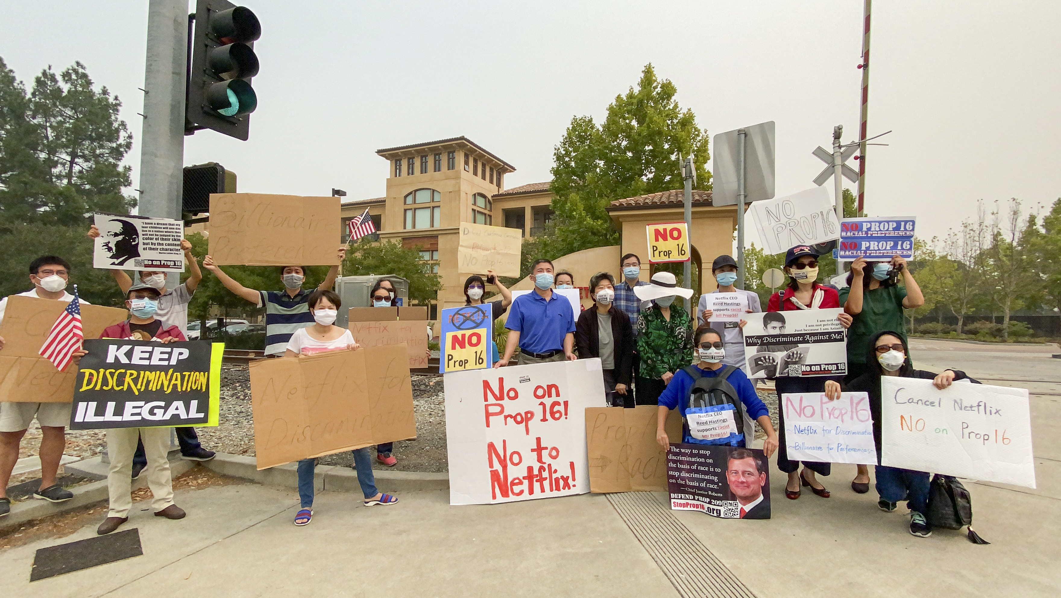 LOS GATOS, Calif.—About 20 protesters gathered at Netflix’s headquarters in Los Gatos, California, on Sept. 11 to oppose an affirmative action bill that a Netflix head supported.