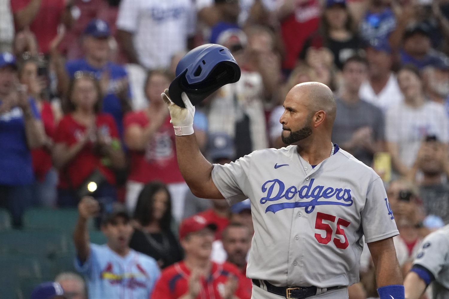 ST. LOUIS—Albert Pujols rewarded an adoring crowd by hitting a home run in his return to Busch Stadium, sending the Los Angeles Dodgers toward a 7-2 win over the St. Louis Cardinals on Sept. 7.