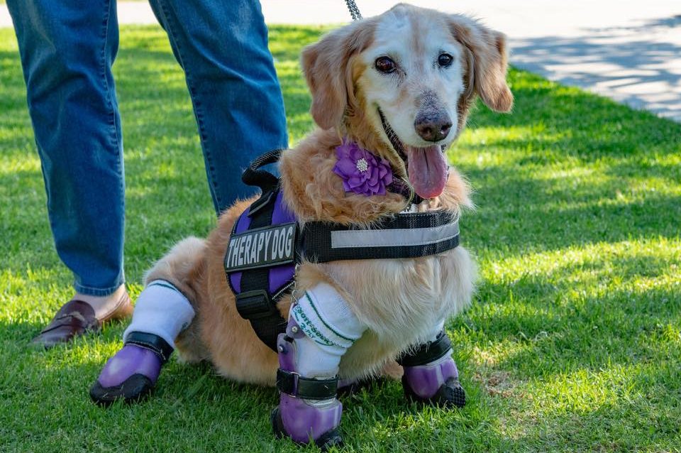 The happy pup now works as a therapy dog and sometimes meets people who are similar to her: those who have lost their limbs.