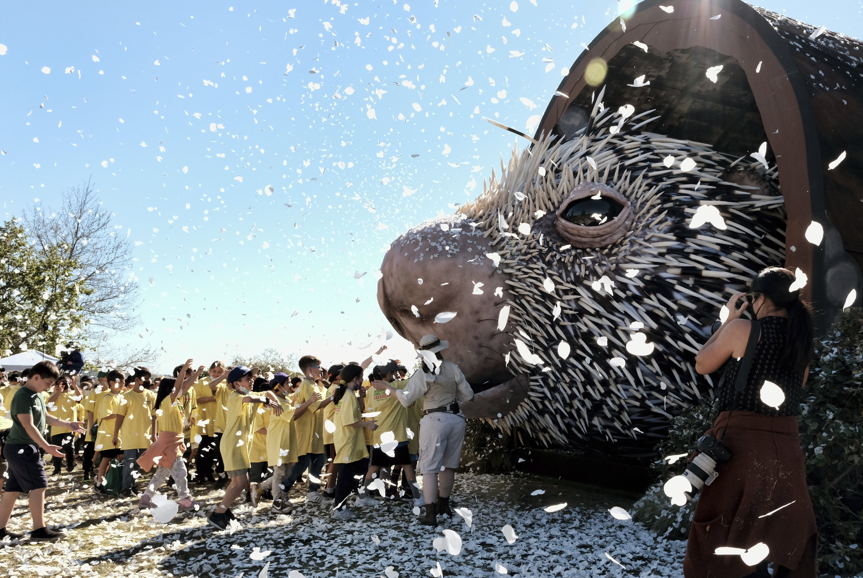 Los Angeles school children reach out to touch a giant puppet porcupine named Percy at Elysian Park in Los Angeles on March 1, 2022. (Richard Vogel/AP Photo)