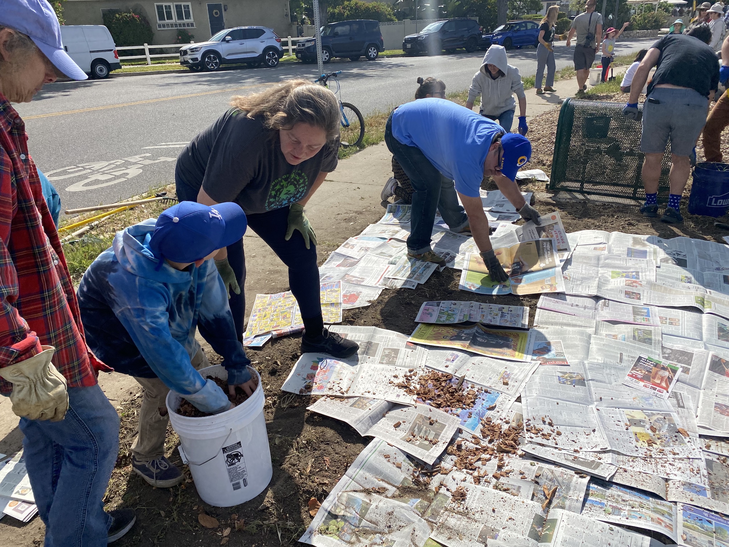 During the workday at the garden, expert gardener Erin Viera-Orr helped volunteers build a foundation to grow native plants by using newspaper, cardboard and mulch.