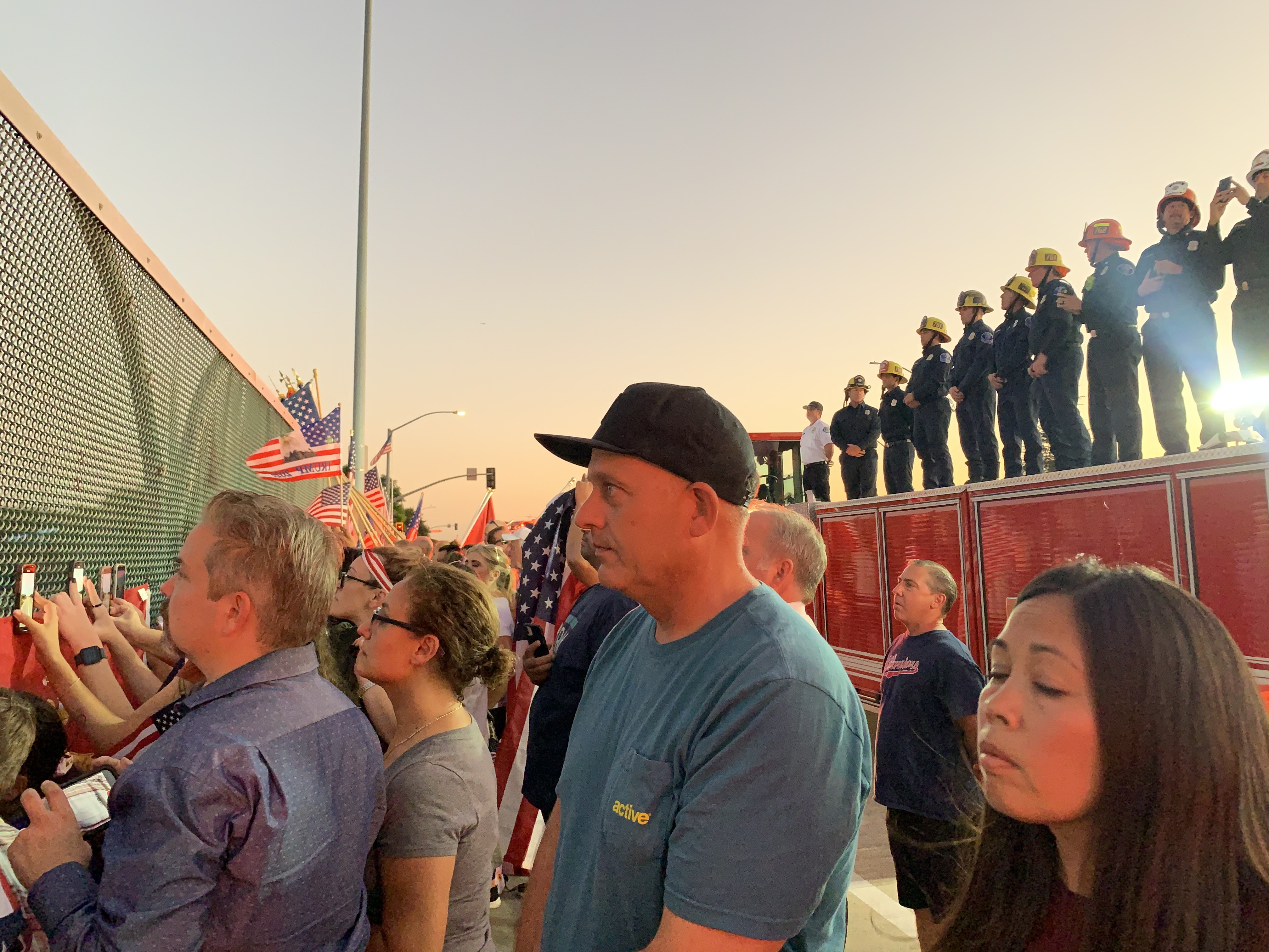 Crowds of people payed tribute by lining the procession’s route and waving American flags. It is estimated that thousands of people filled the 15-mile line on sidewalks, and planted American flags on overpasses in California’s Inland Empire to pay tribute to Merola.