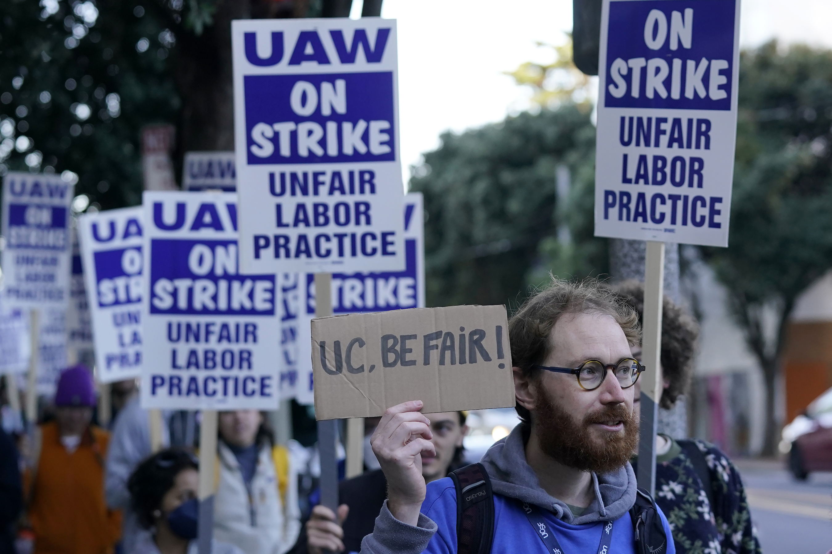 People take part in a protest outside of the University of California San Francisco medical offices in San Francisco, Nov. 14, 2022. Nearly 48,000 unionized academic workers at all 10 University of California campuses have walked off the job Monday. (Jeff Chiu/AP Photo)