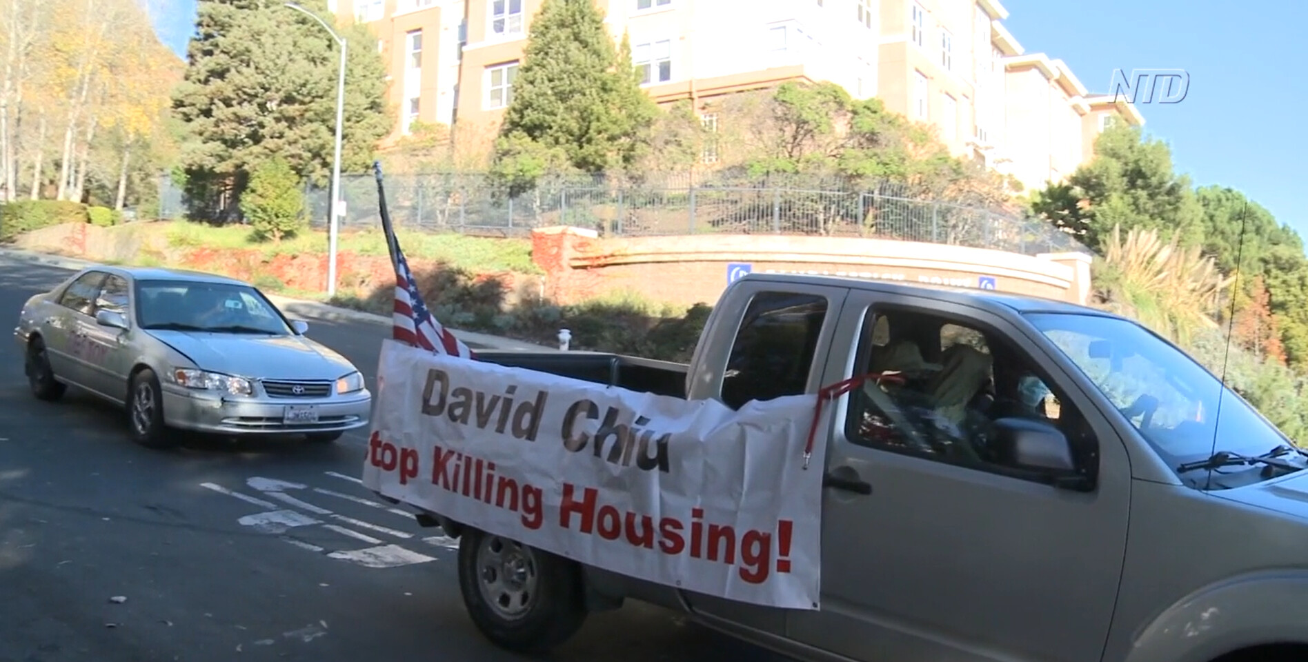 A group of Bay Area residents drove by and honked in protest near the residence of assembly member David Chiu. He authored assembly bill 3088. Many protesters called him a communist.