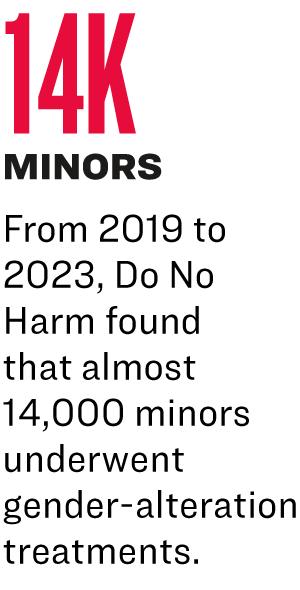 Based on health insurance claims and multiple other sources for the 2019 through 2023 period, Do No Harm found that almost 14,000 minors underwent gender-alteration treatments. Of that number, almost 6,000 had gender-alteration surgeries, and more than 8,500 received hormones and puberty blockers. Almost 63,000 transgender-related prescriptions were written for minors.