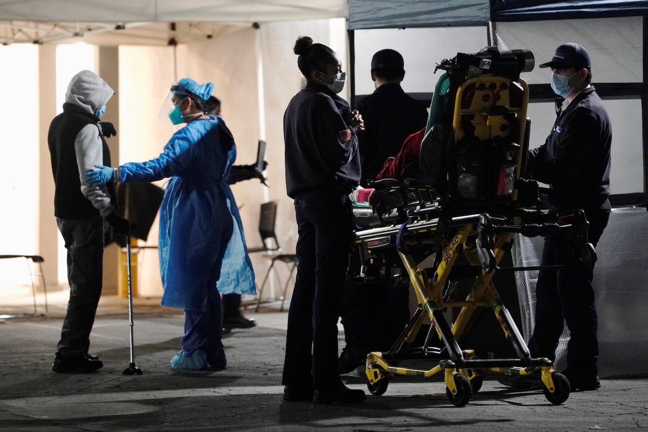 Healthcare workers treat patients outside the emergency room at the Community Hospital of Huntington Park in Huntington Park, California, on Dec. 29, 2020. (Bing Guan/Reuters)
