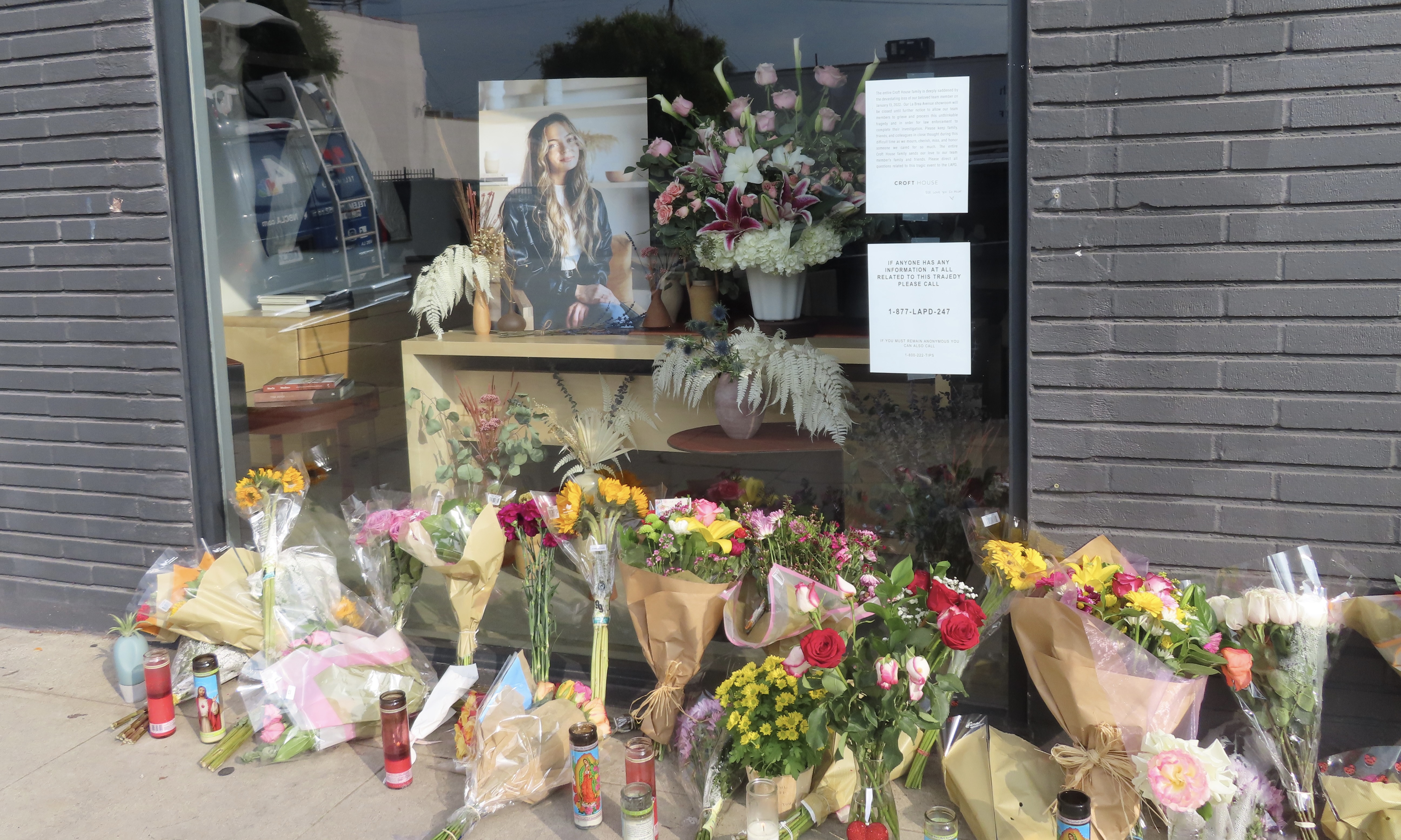 Flowers placed outside Croft House furniture store in memory of graduate student Brianna Kupfer, in Los Angeles on Jan. 18, 2022. (Alice Sun/The Epoch Times)