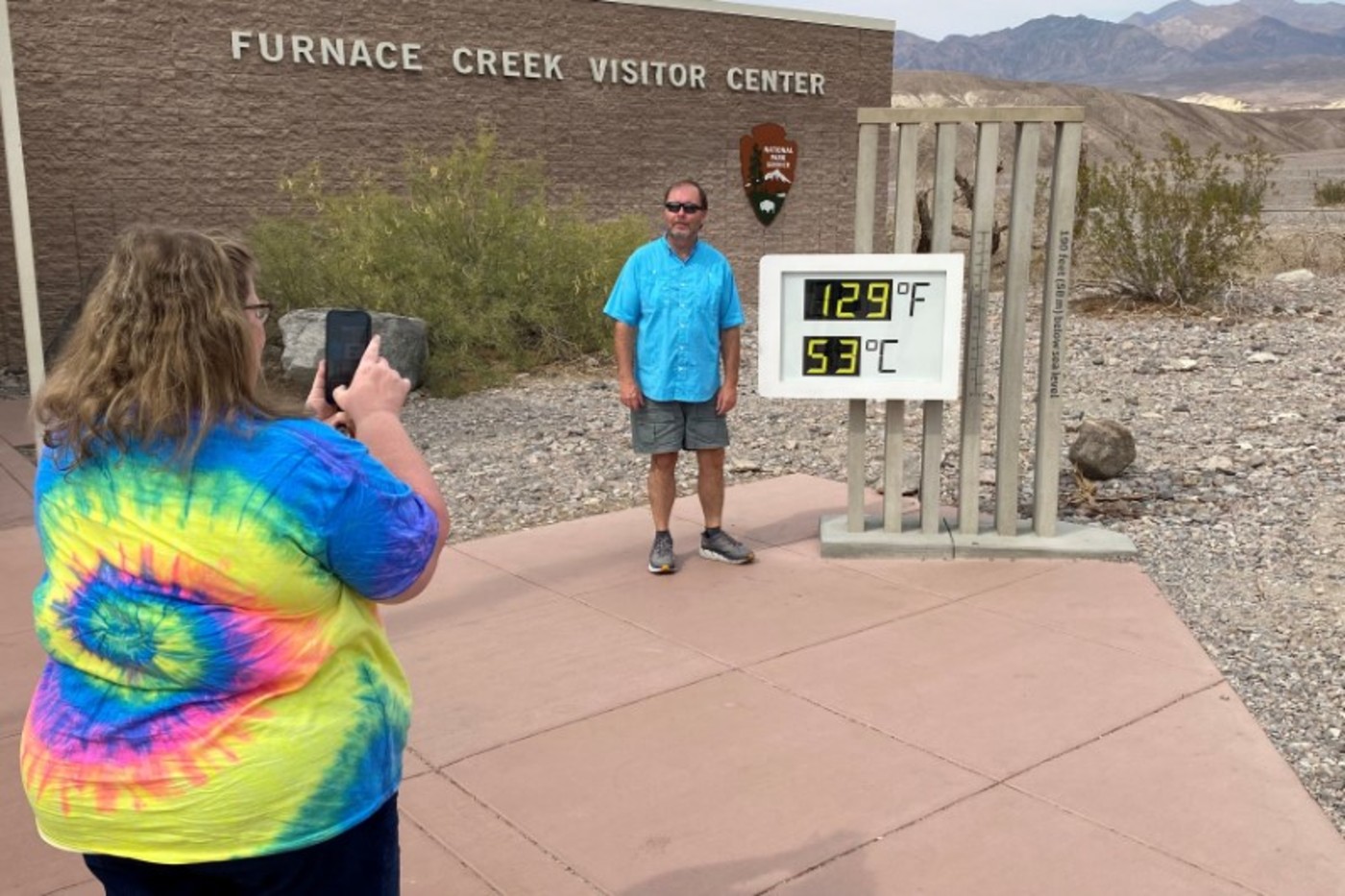 Lana, 43, a tourist from North Carolina, poses for a picture holding an umbrella at Badwater Basin, the lowest point of North America below sea level in Death Valley, Calif., on June 16, 2021. (Norma Galeana/Reuters)