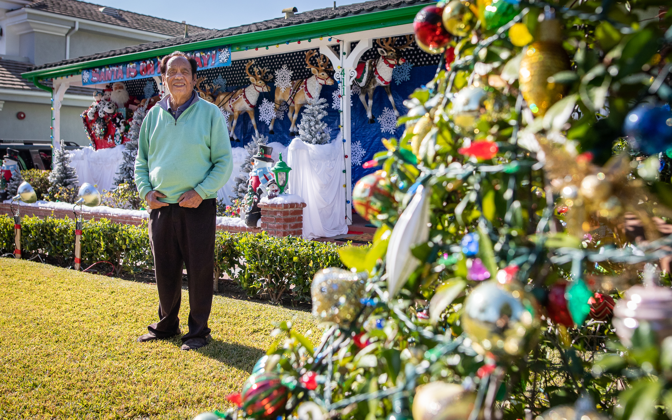 This year, his design includes a giant Santa Claus flying in a sleigh led by four large reindeer, affixed to his porch as if actually flying through the air. In the background, Val has Christmas music playing through speakers.