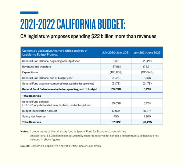Instead, the stock market rose 16 percent in 2020, state income tax receipts were high, and the state was able to add $22 billion to its General Fund reserve account—the same amount the legislature wants to withdraw during the 2021–2022 budget year.