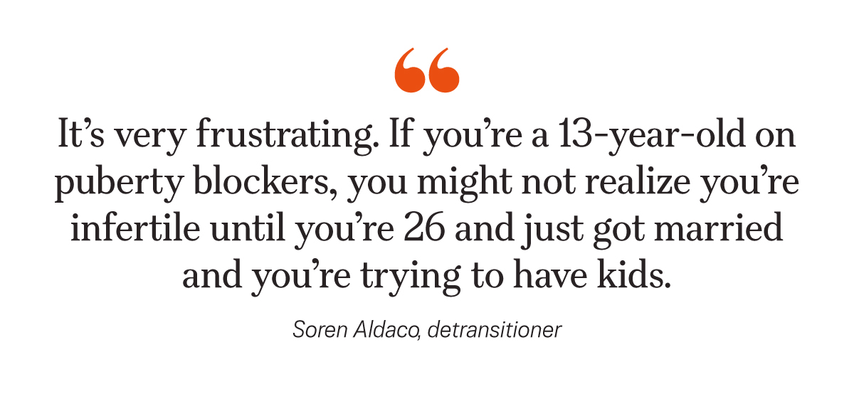“It’s very frustrating,” she said. “If you’re a 13-year-old on puberty blockers, you might not realize you’re infertile until you’re 26 and just got married and you’re trying to have kids.”