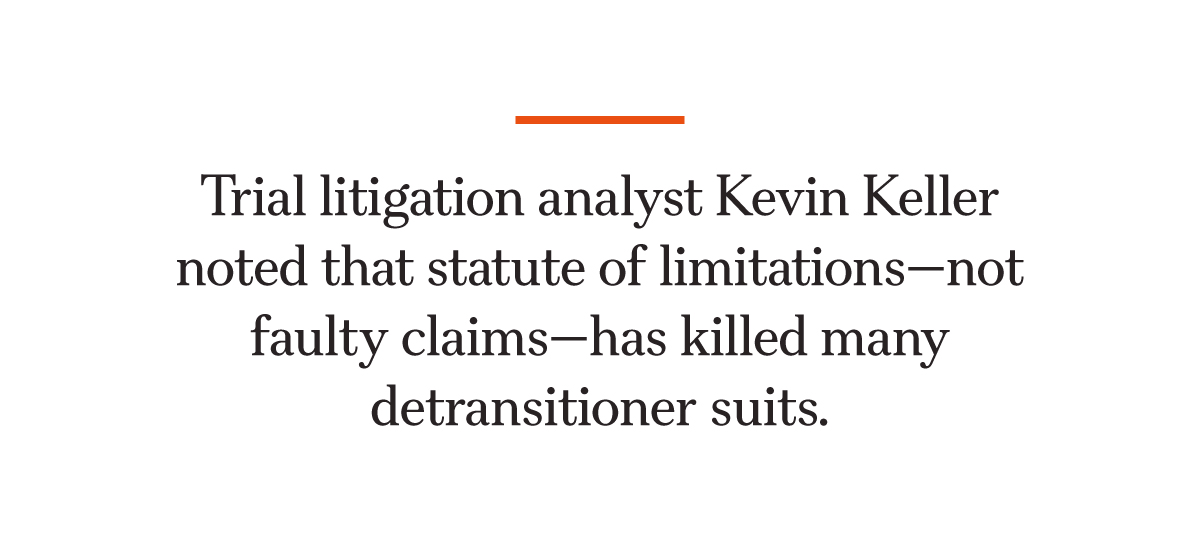 Trial litigation analyst Kevin Keller noted that the statute of limitations—not faulty claims—has killed many detransitioner suits. When addressing the issue publicly, he said that no case has been dismissed for lack of merit.