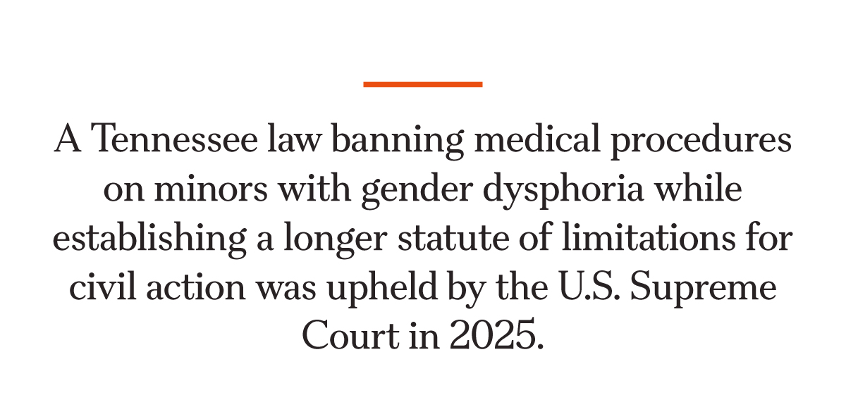 Tennessee’s Senate Bill 1, which became law in 2023, banned medical procedures on minors with gender dysphoria, but it also established a longer statute of limitations for civil action extending 30 years from the date that the minor reaches age 18, or 10 years after the minor’s death if he or she dies before then.