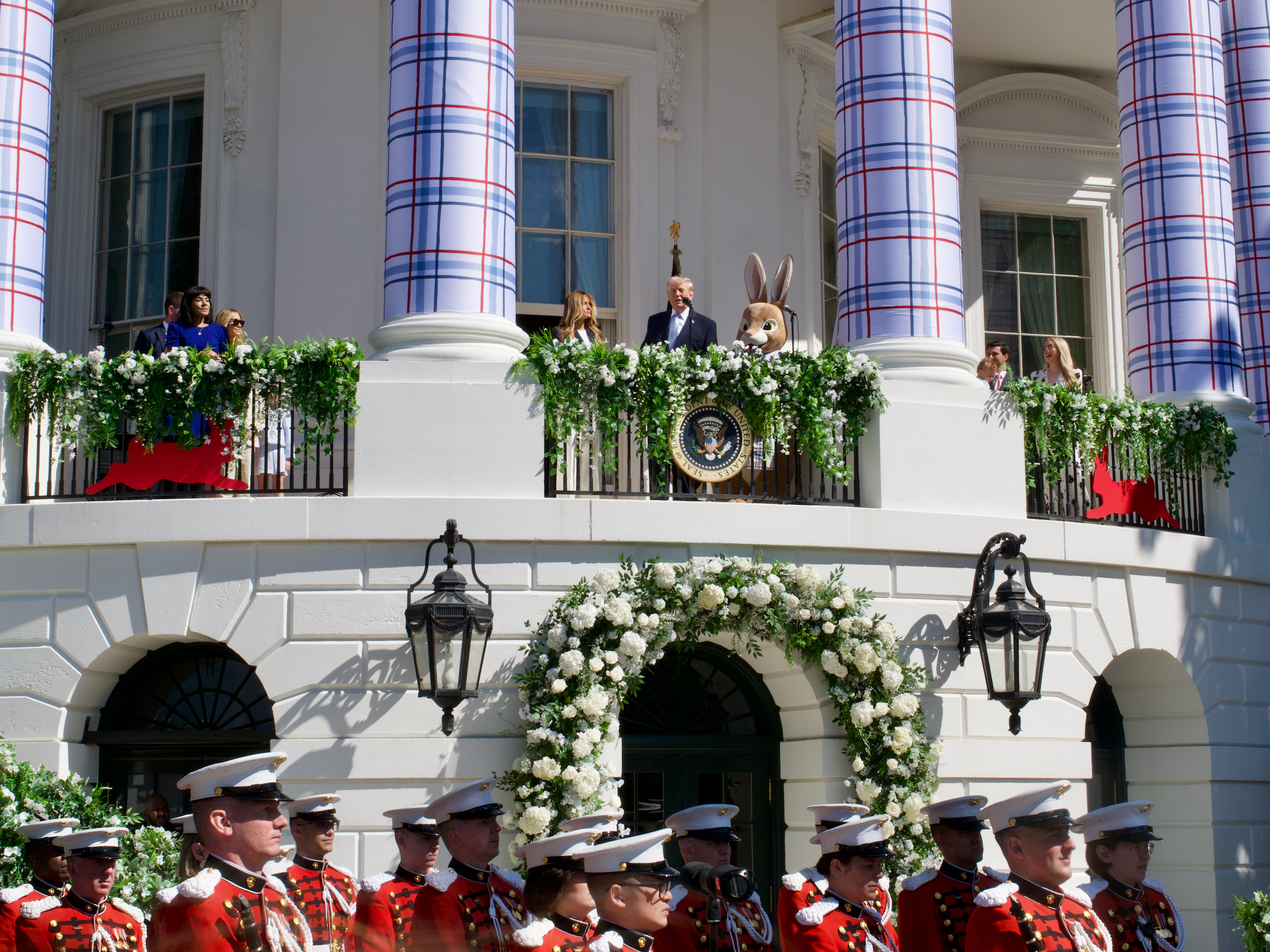 White flowers adorned the portico handrails, with the columns wrapped in a massive red, white, and blue plaid design.
