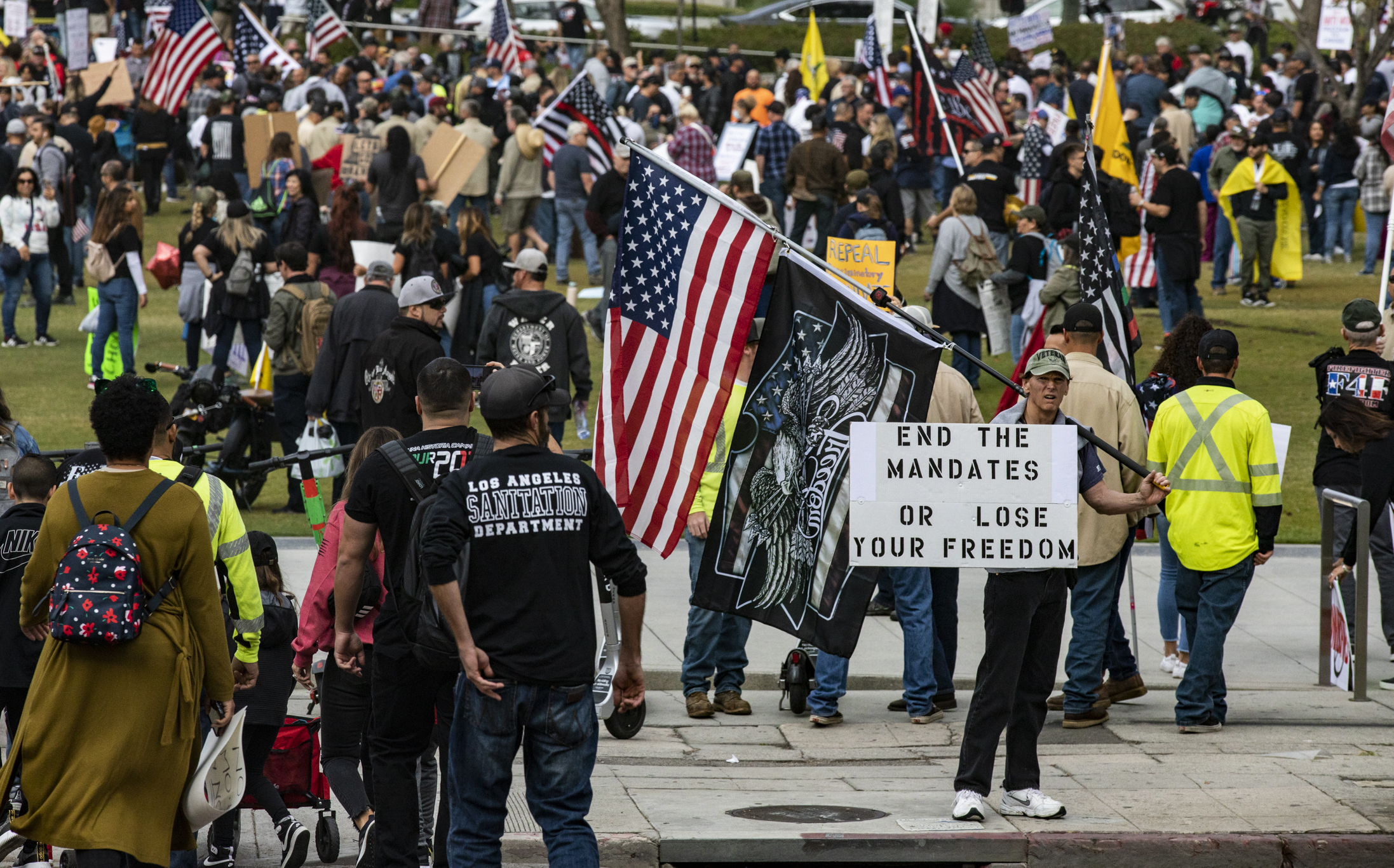 Thousands gathered in front of the Los Angeles City Hall Nov. 8, protesting the city’s upcoming December deadline for terminating all city employees and contractors unvaccinated against COVID-19.