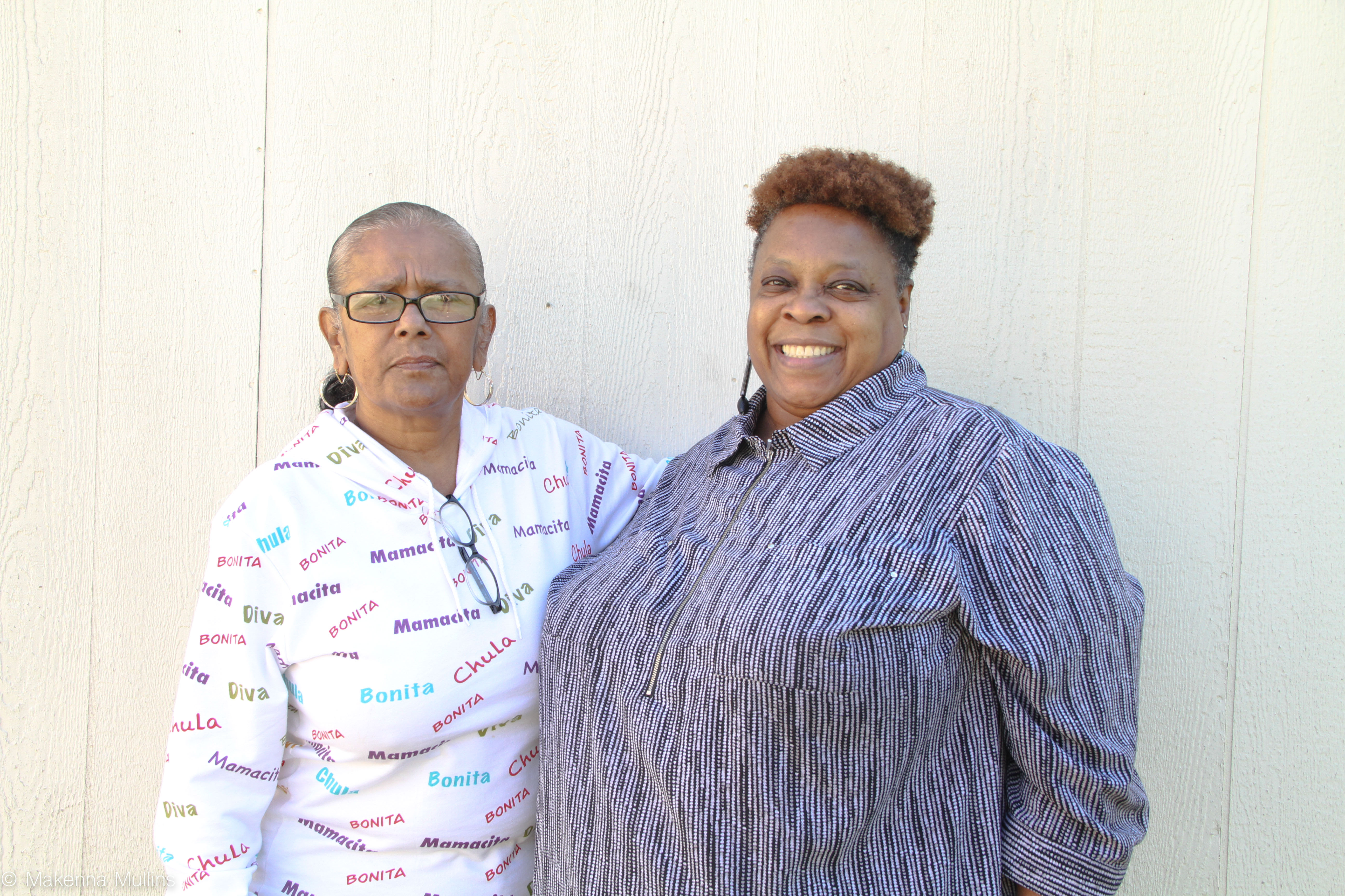 Phyllis McNeal (R) with one of the many people she has helped turn from a life of crime and addiction, Donna Reed, through her program Straight Talk, based in Norco, Calif. (Makenna Mullins for The Epoch Times)