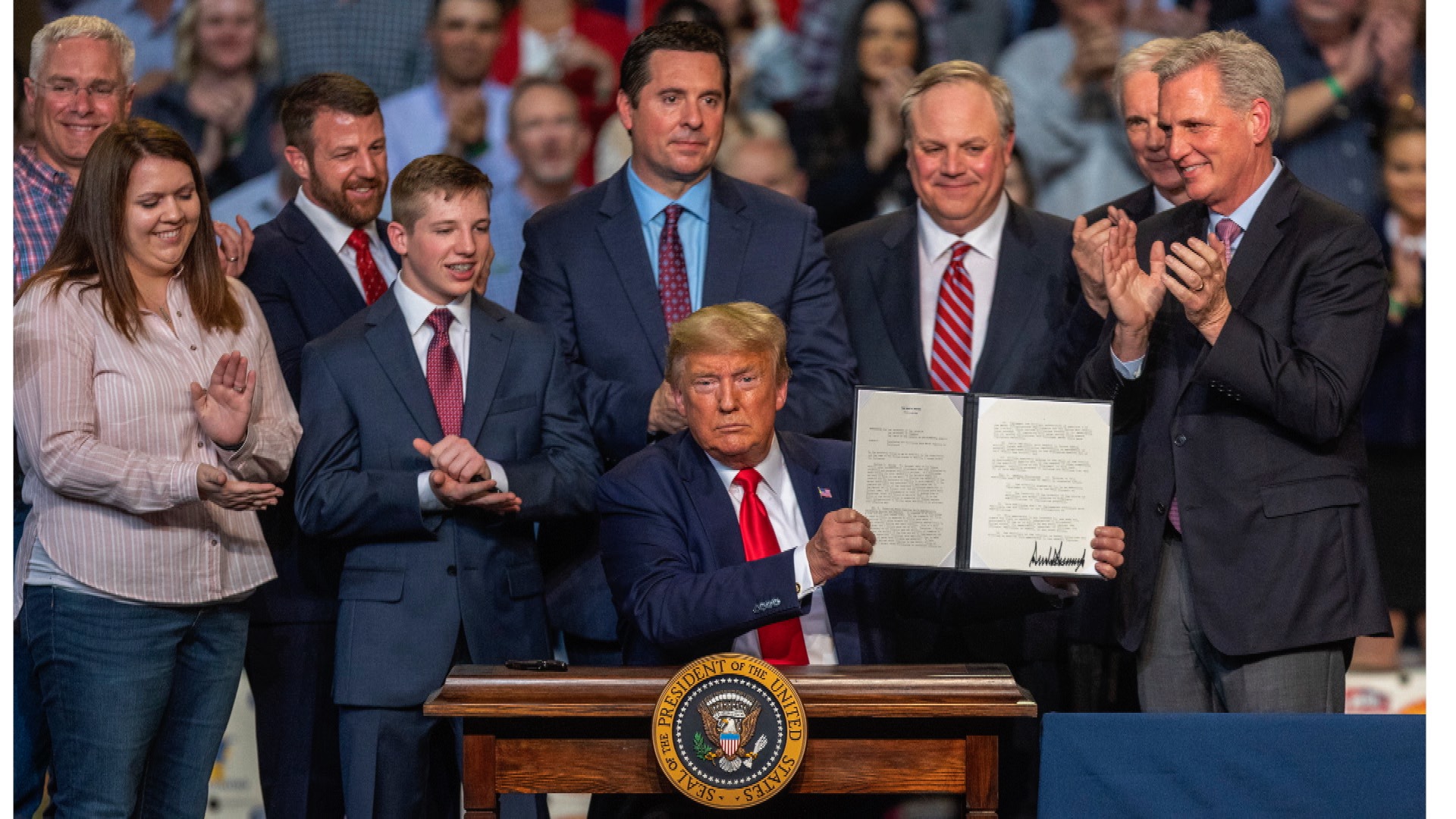 A farmer praises President Donald Trump as House Minority Leader Kevin McCarthy looks on during a legislation signing rally with local farmers in Bakersfield, California, on Feb. 19, 2020. (David McNew/Getty Images)