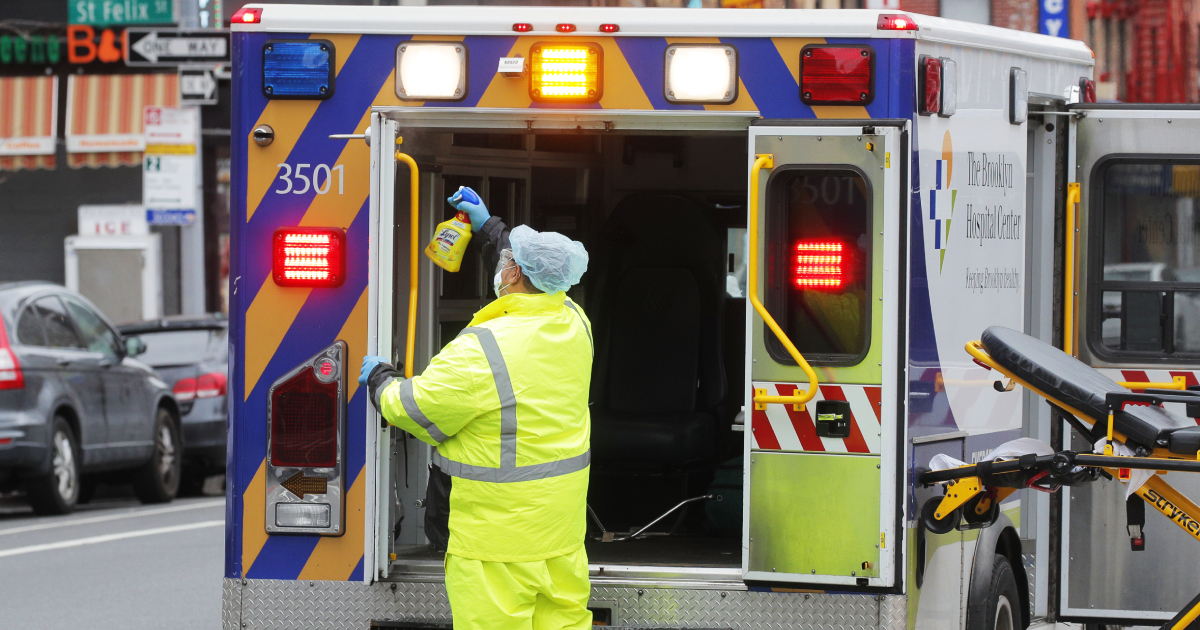 An ambulance worker sprays disinfectant on a stretcher outside The Brooklyn Hospital Center during the coronavirus disease (COVID-19) outbreak in the Brooklyn borough of New York City, New York, U.S., March 31, 2020. (Brendan Mcdermid/Reuters)