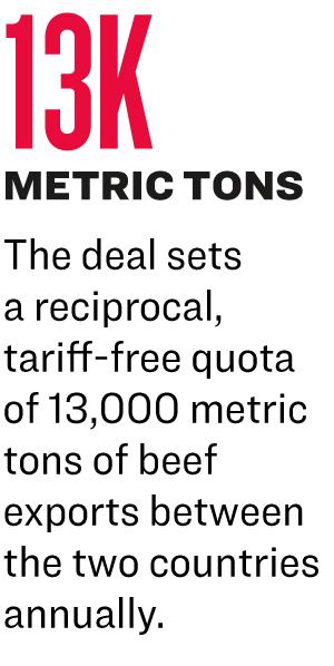 Trump has touted the deal, which establishes a reciprocal tariff-free quota of 13,000 metric tons of beef exports between the two countries each year—as a breakthrough that will increase access for “virtually all of the products produced by our great farmers.”