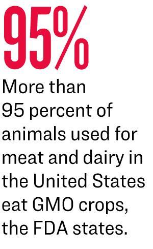 Meanwhile, more than 95 percent of animals used for meat and dairy in the United States eat genetically modified crops, according to the FDA.