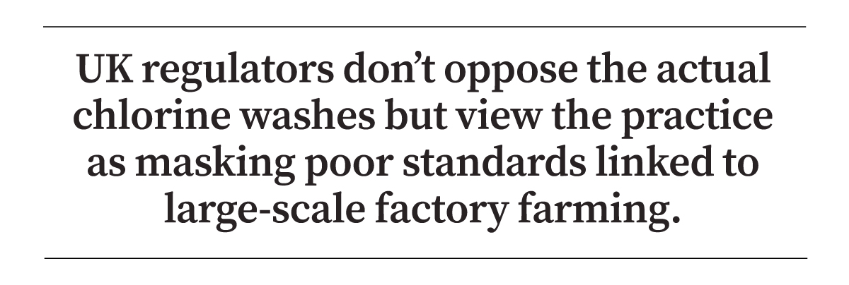 UK regulators do not have an issue with the chlorine wash itself; both the UK and the EU permit chlorine washing. The UK approach is based on the position that proper hygiene and animal welfare make chlorine washing unnecessary—it is seen as a cover-up for low standards associated with large-scale factory farming.